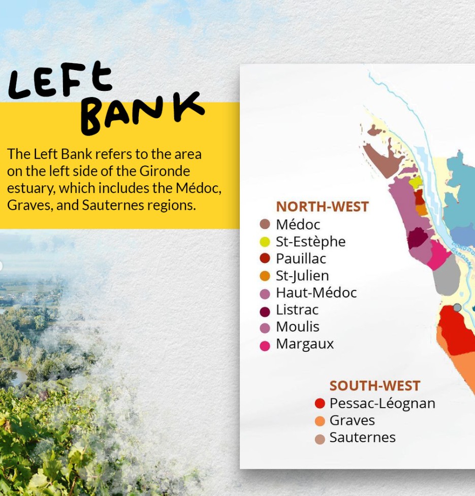 보르도 좌안, 메독지구는 숙성 잠재성을 끌어올려주는 따뜻하고 건조한 자갈지대로 카베르네 소비뇽의 재배에 이상적입니다. 보르도 우안 지역은 숙성 잠재성을 제한하는 서늘하고 축축한 점토지대로 메를로의 재배에 더 적절합니다.
