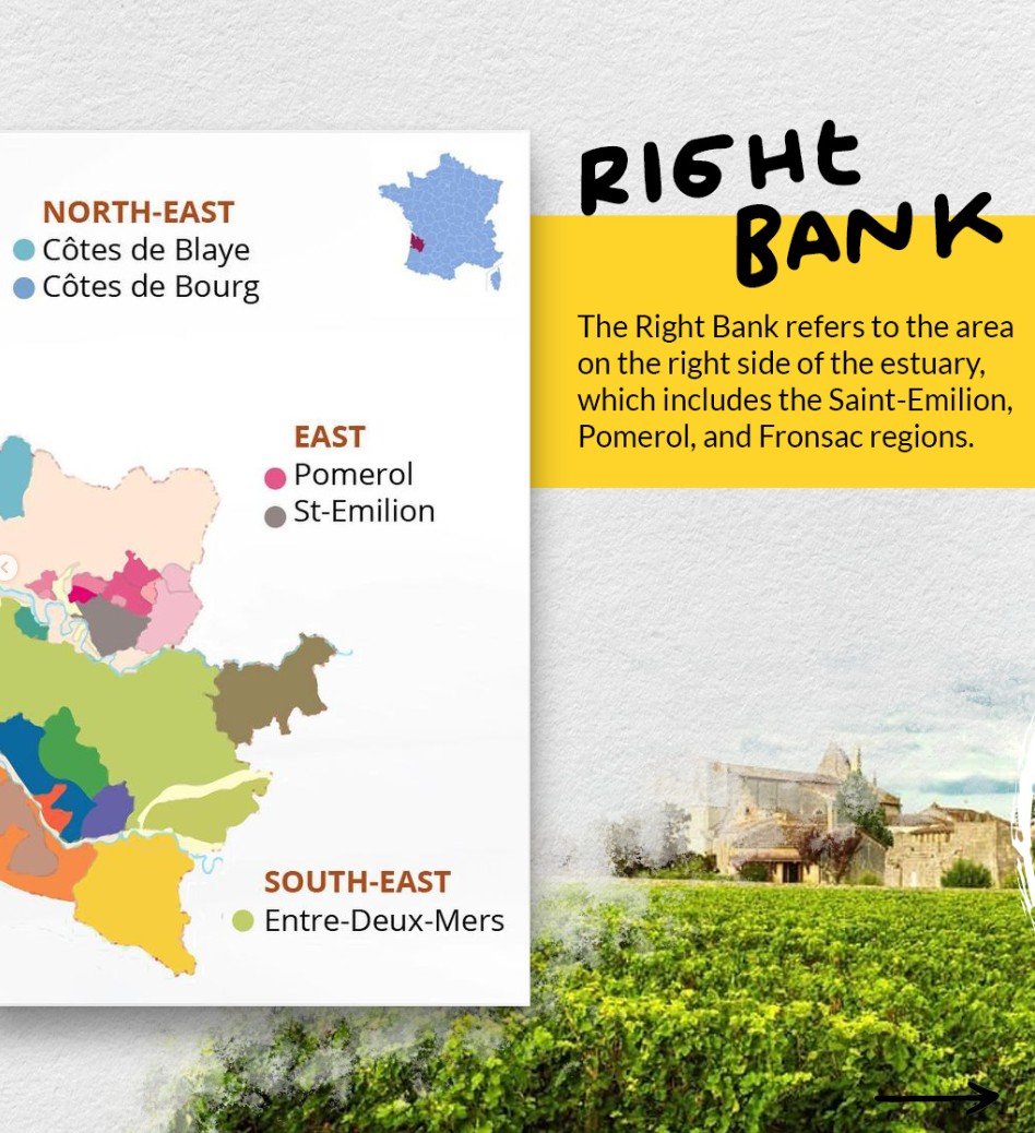 한편 숙성이 빠른 메를로는 점토지대에서 더 신뢰성 높은 와인으로 만들어집니다. 하지만 이곳 점토지대의 땅은 좌안 쪽 자갈지대보다 경작 조건이 덜 이상적인 편이라 와인에 대한 평가도 상대적으로 낮으며, 그에 따라 대다수가 보르도 지역단위 등급의 평상시 와인으로 팔리고 있습니다.